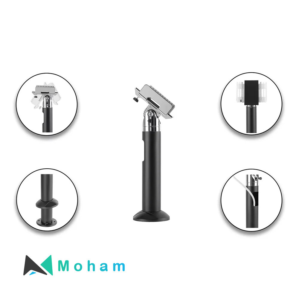 The SH 004PS offers an adjustable width that accommodates most popular point of sale terminals and ample vertical and horizontal movement to accommodate any customer needs. Installs quickly using the included 3M type adhesive tape or can be permanently installed to any surface via a drilled hole and bolt mount. Internal cable management protects data and wire from harm, damage, and theft.