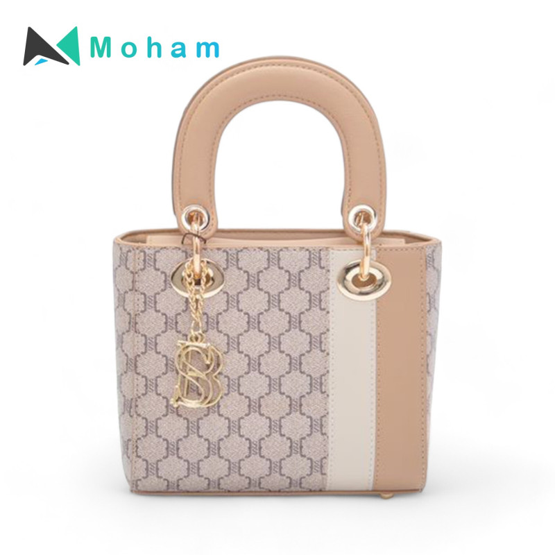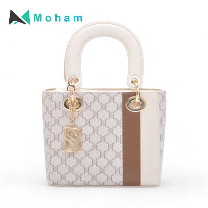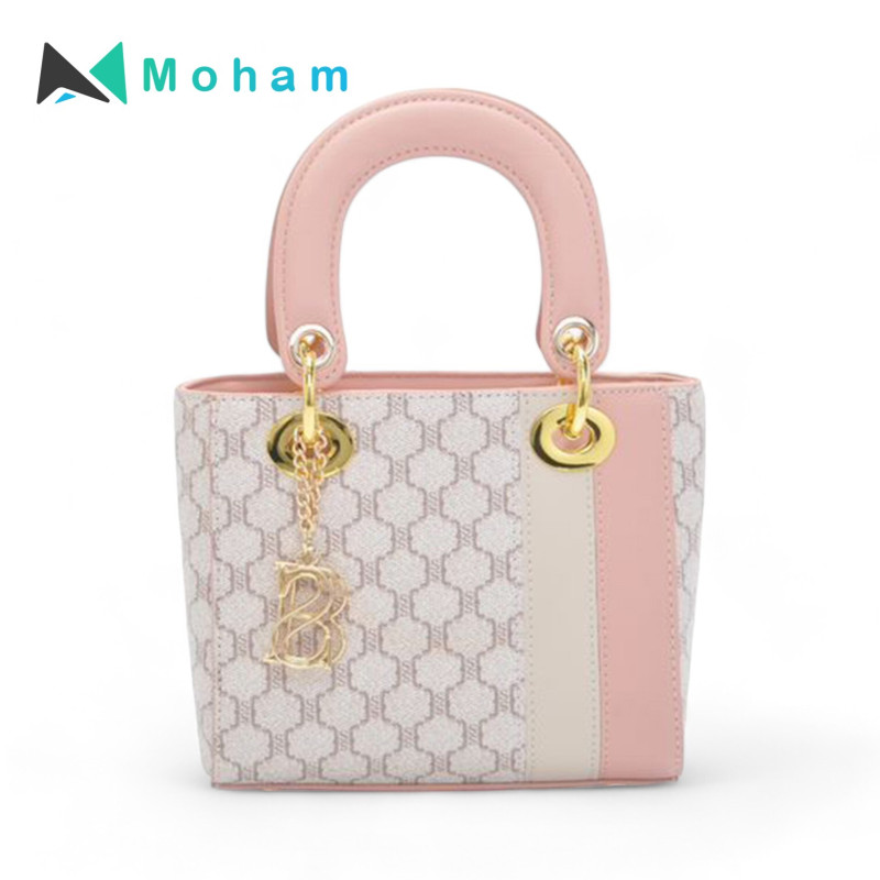 Featuring a trendy geometric pattern, faux leather accents, and a gold charm, this bag is both stylish and functional.