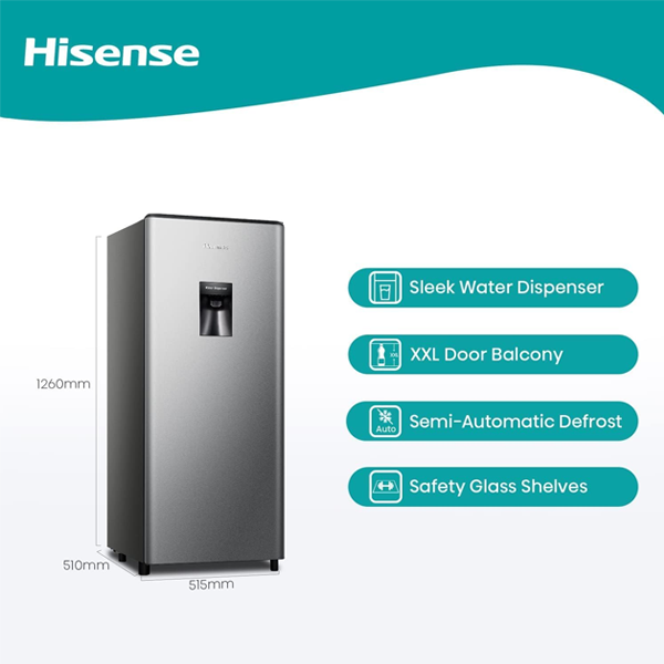 Hisense 233 Liter Refrigerator, Single Door Compact Silver, With Water Dispenser, Model RR233N4WSU -1 Years Full & 5 Years Compressor Warranty.