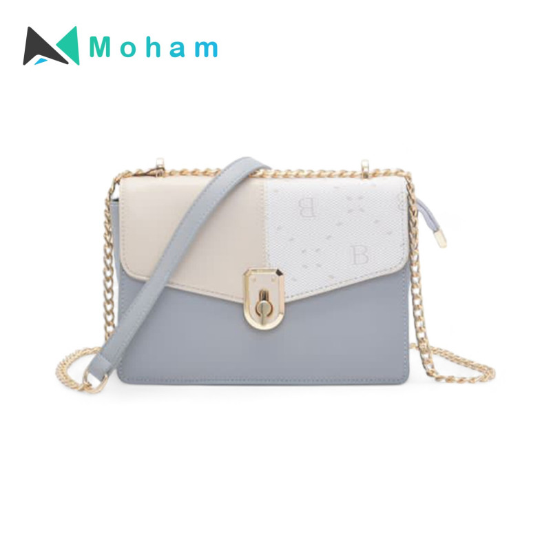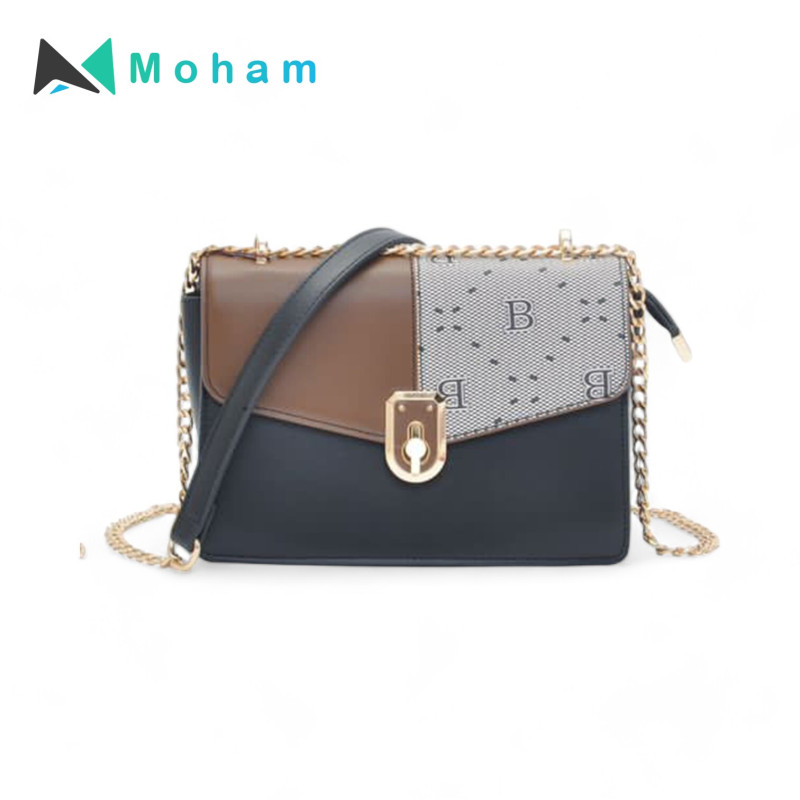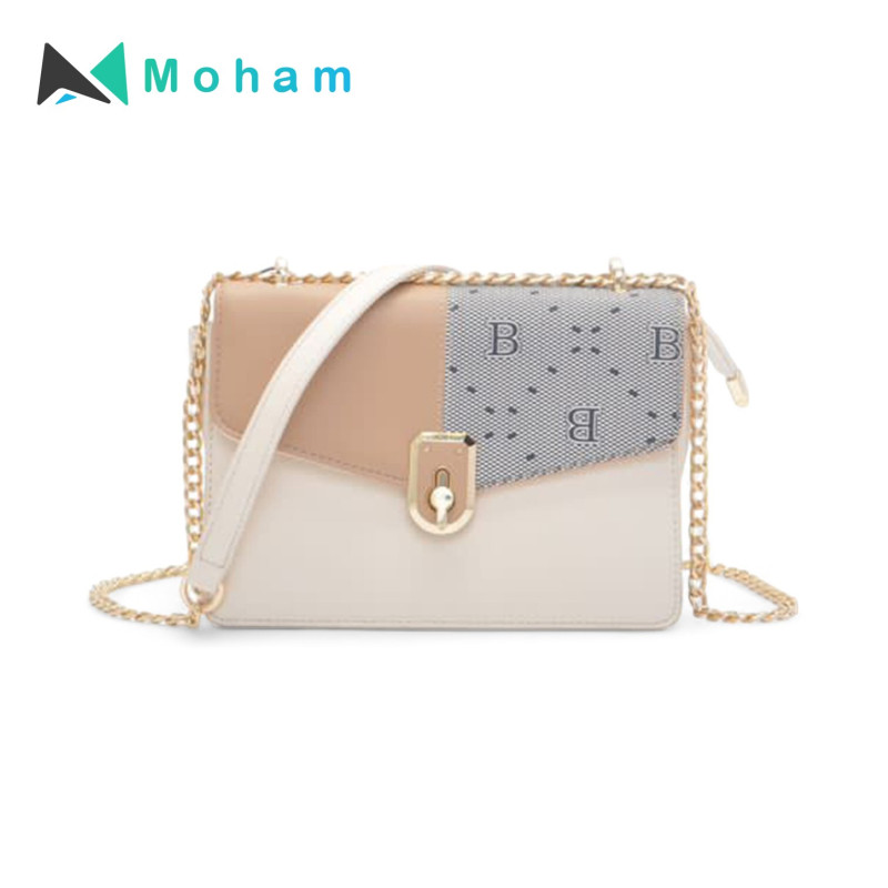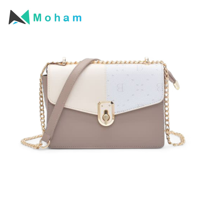 Featuring a trendy monogram pattern, contrasting color panels, and a gold chain strap, this bag is both stylish and functional.
