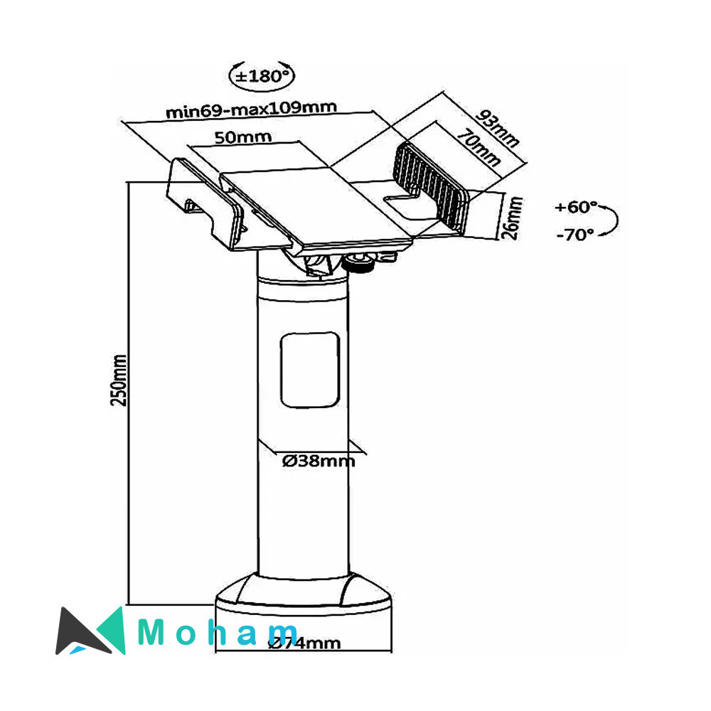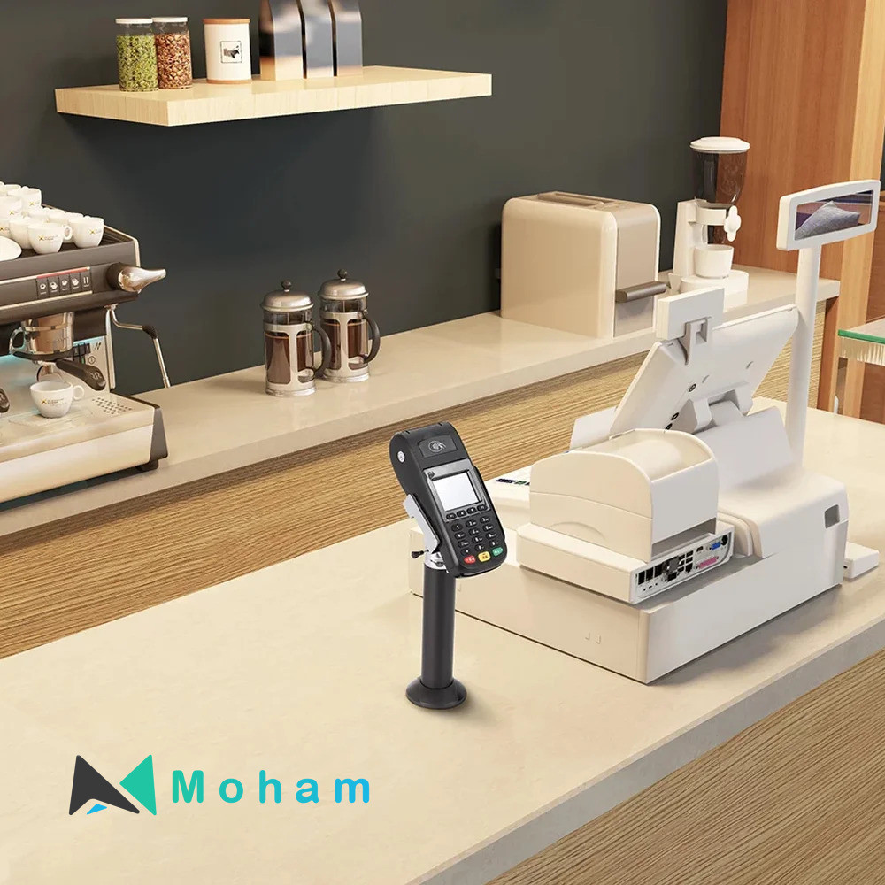 The SH 004PS offers an adjustable width that accommodates most popular point of sale terminals and ample vertical and horizontal movement to accommodate any customer needs. Installs quickly using the included 3M type adhesive tape or can be permanently installed to any surface via a drilled hole and bolt mount. Internal cable management protects data and wire from harm, damage, and theft.