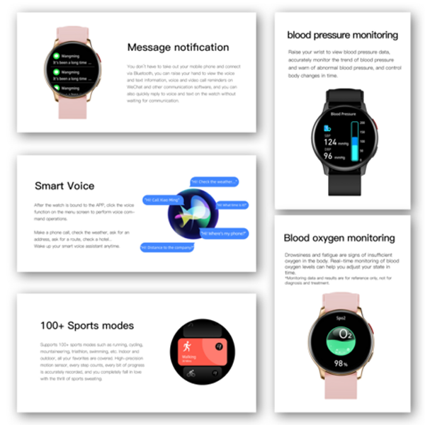 • Watch function: Bluetooth call, breathing training, blood pressure, blood oxygen, sleep mode, step/calorie counting, sedentary reminder, water reminder, remote photo, third-party weather, music control, find your phone, screen brightness adjustment, bright screen length adjustment, alarm clock reminder, incoming call/text message reminder, flip the wrist and brighten the screen, Do Not Disturb Mode, target reach reminder, information storage capacity (5 messages), stopwatch, flashlight