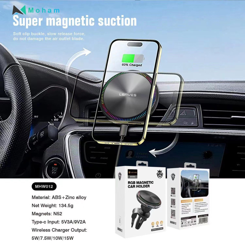 Material: ABS, zinc alloy -Weight: Sheet1!D19 -'CAR HOLDER'!Magnet: N52 -Type-C input: 5V3A/9V2A -Wireless charging output: 5W/7.5W/10W/15W With air outlet bracket - Super strong magnetic attraction -CD grain processing - Zinc alloy housing -15W fast charging - Colourful running lamp