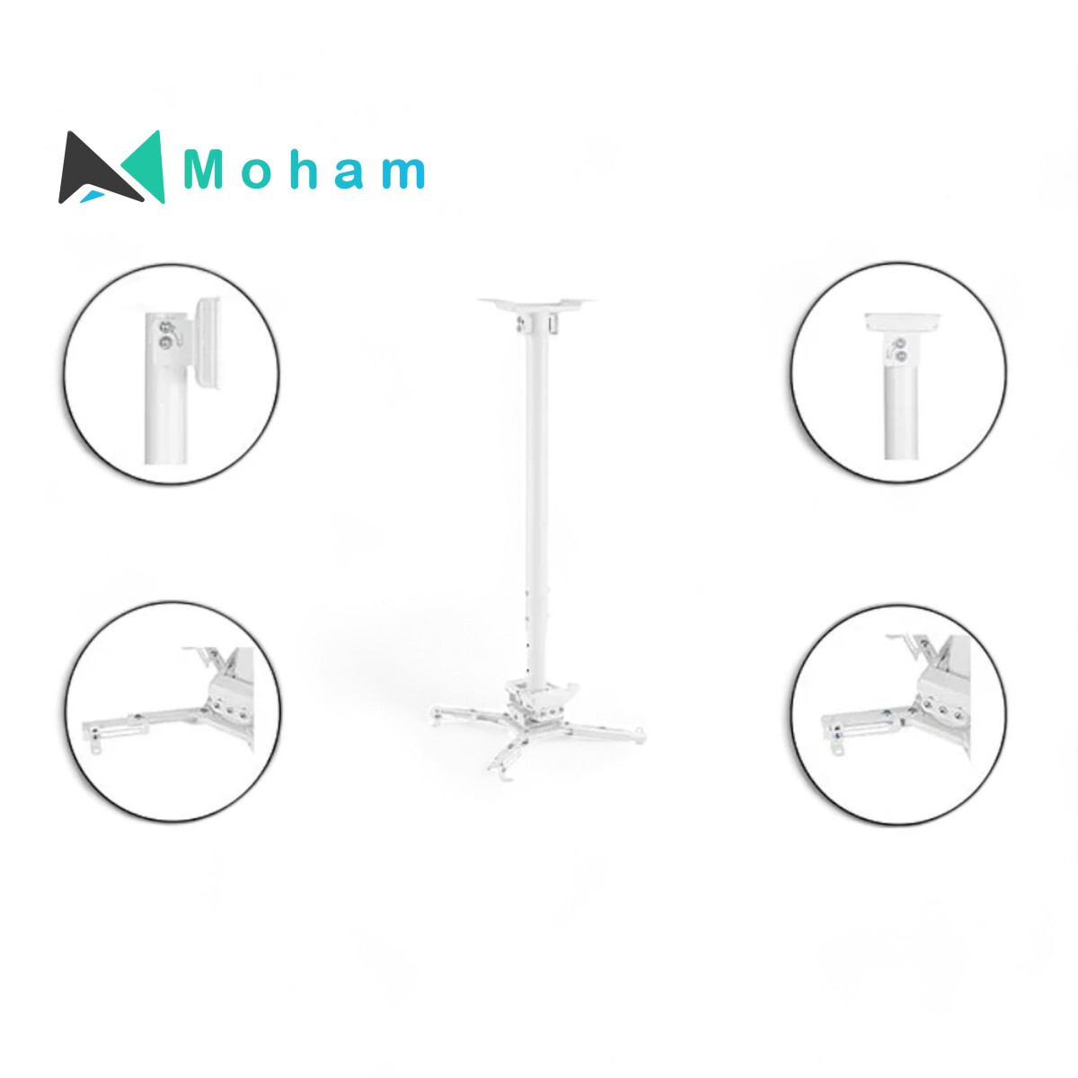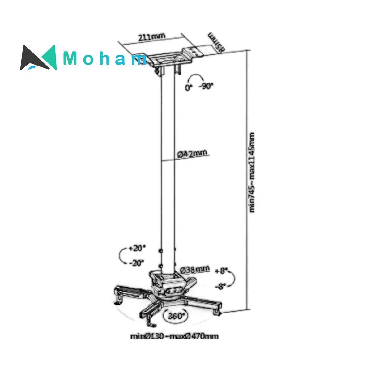 The SH 08P Solid Ceiling Projector Bracket is a reliable and versatile mounting solution for projectors, ideal for both home and professional settings. Constructed from durable steel and plastic materials, this bracket is built to last and is coated with a sleek matte white powder finish, ensuring it seamlessly integrates into any environment.With dimensions measuring 1145x470x470mm, this projector bracket offers ample space and stability for mounting projectors securely. It has a robust weight capacity of 35kg, making it suitable for a wide range of projector models. The mounting range from 130mm to 470mm provides flexibility in positioning, allowing for various projection distances from the ceiling.This projector bracket offers extensive adjustability options to achieve the perfect projection angle. It features a tilt range of +20° to -20°, a swivel range of +8° to -8°, and a rotation capability of +180° to -180°. These adjustments provide precise control over the projection angle and orientation, enabling users to align the projector accurately with the screen or surface.