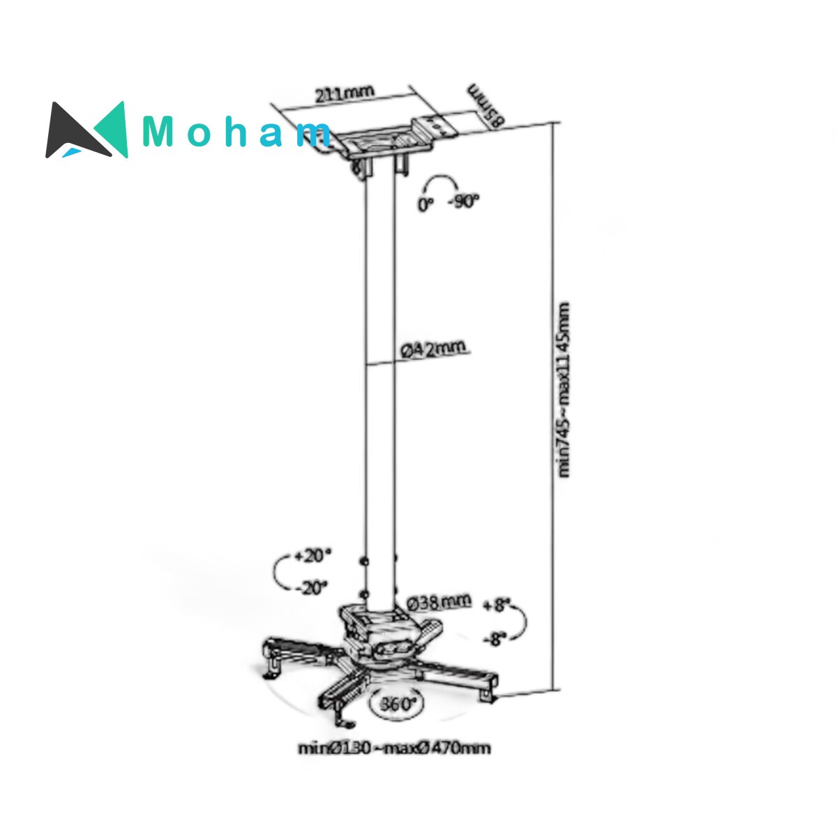 The SH 08PB Solid Ceiling Projector Bracket is a dependable and practical solution for mounting projectors, designed for a seamless integration into various environments. Crafted from sturdy steel and plastic materials and coated with a professional matte white powder finish, this bracket offers durability and a sleek appearance. With dimensions measuring 1145x470x470mm, this projector bracket provides ample space and stability for secure projector mounting. It boasts a robust weight capacity of 35kg, accommodating a wide range of projector models. The mounting range from 130mm to 470mm allows for flexible positioning, enabling variable projection distances from the ceiling. This projector bracket offers extensive adjustment capabilities, ensuring precise projection angles. It features a tilt range of +20° to -20°, a swivel range of +8° to -8°, and a rotation capacity of +180° to -180°. These adjustments provide flexibility in aligning the projector accurately with the screen or surface, enhancing the viewing experience.